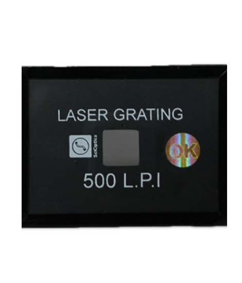 Laser Grating 500 L P I is mounted in 60 MM x 45 MM glass frame with inner size window 10 MM x 10 MM.
