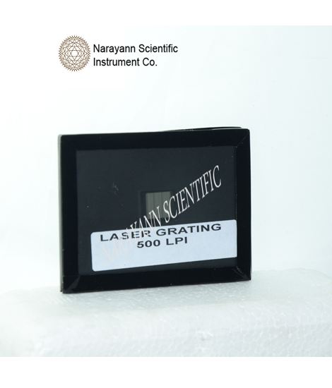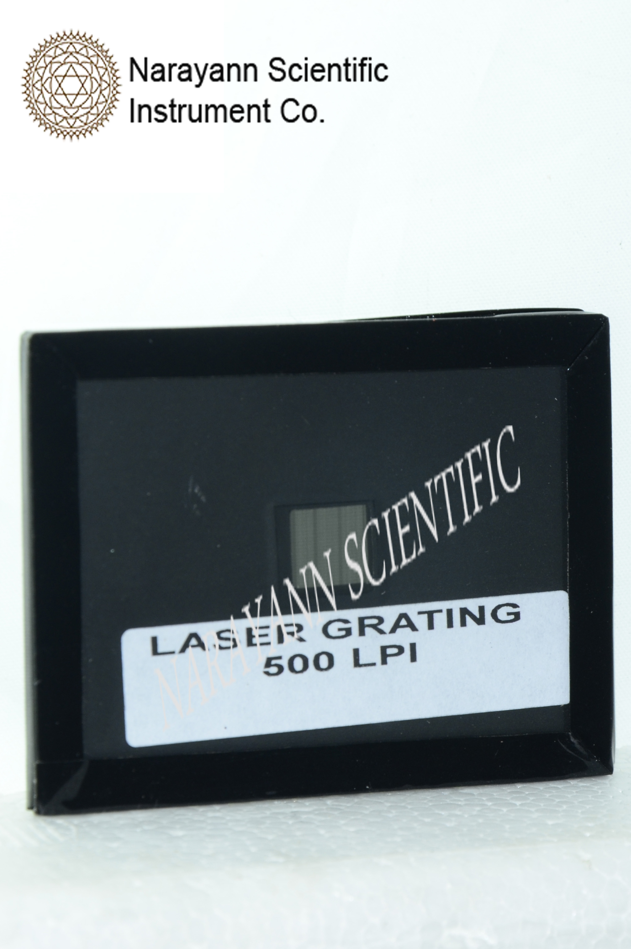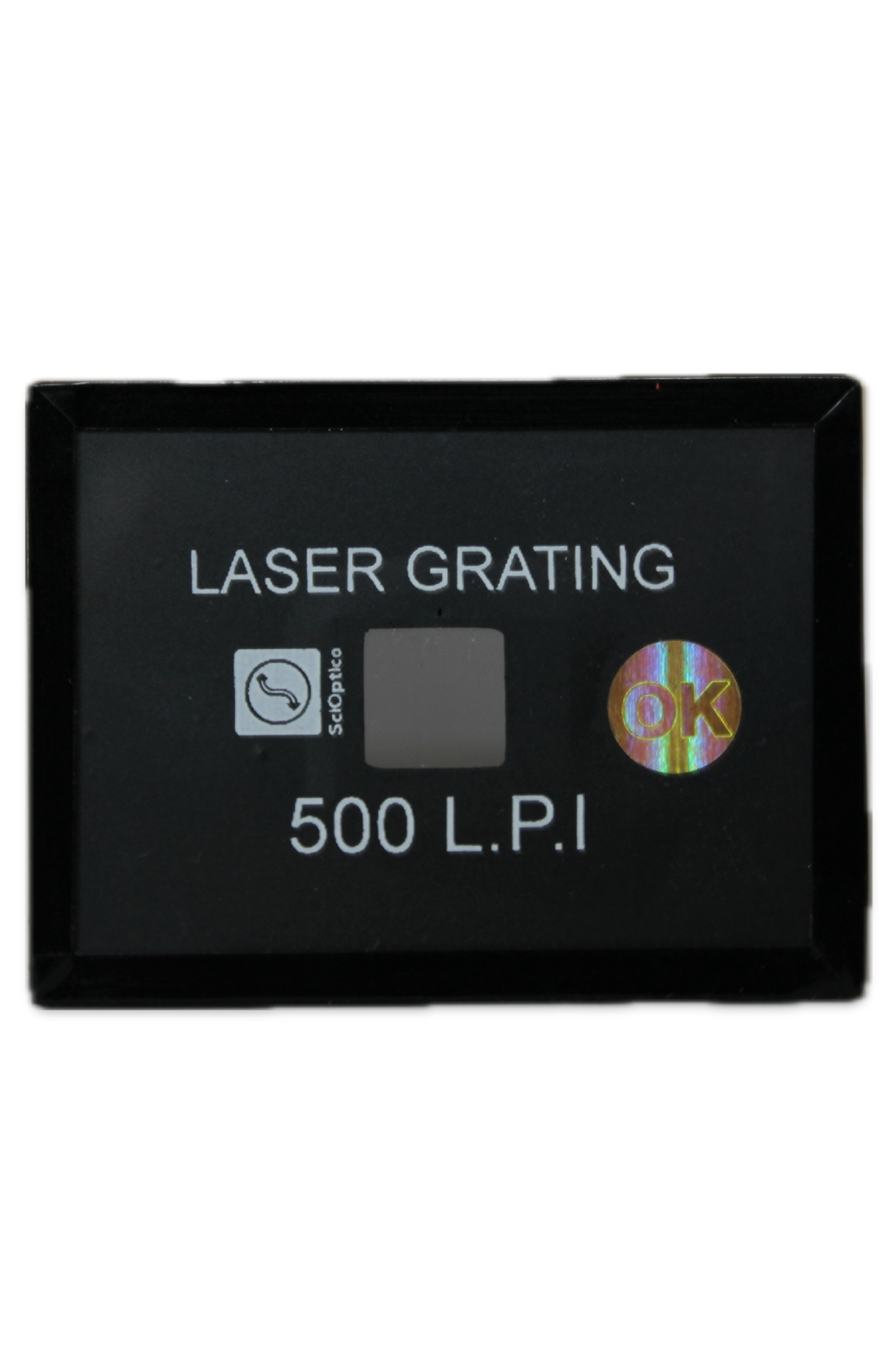 Laser Grating 500 L P I is mounted in 60 MM x 45 MM glass frame with inner size window 10 MM x 10 MM.